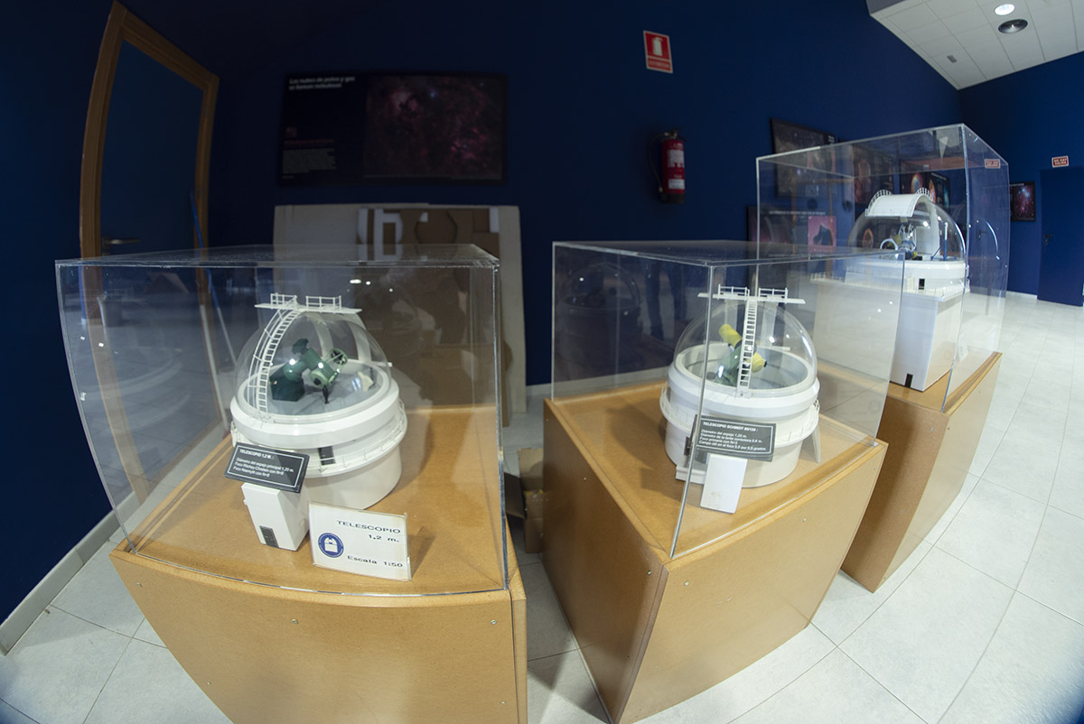 Im Foyer zwischen Vortragssaal und Planetarium stehen Funktionsmodelle der Teleskope auf dem Calar Alto.